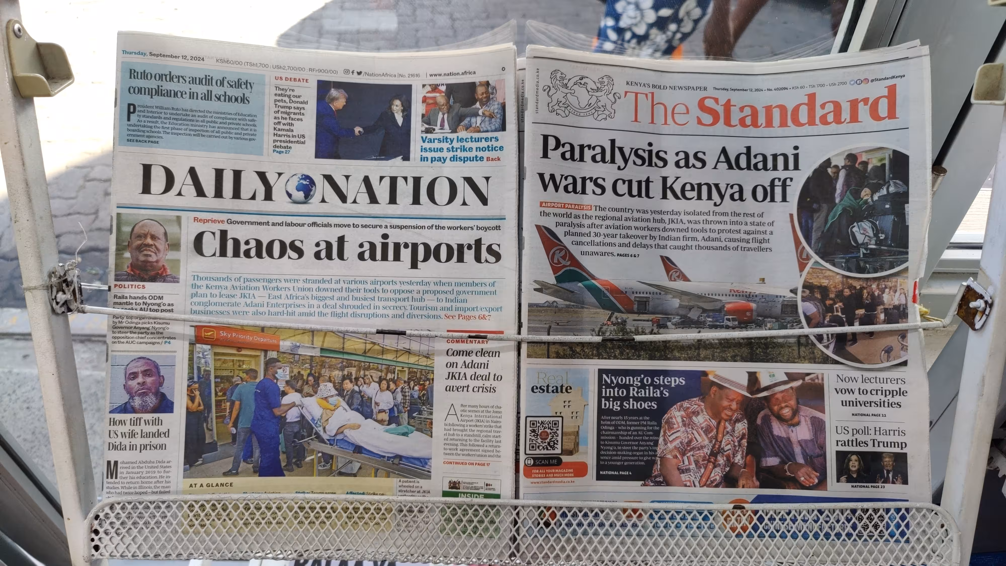 Newspapers at a stand in Kenya covering news on the airport closure