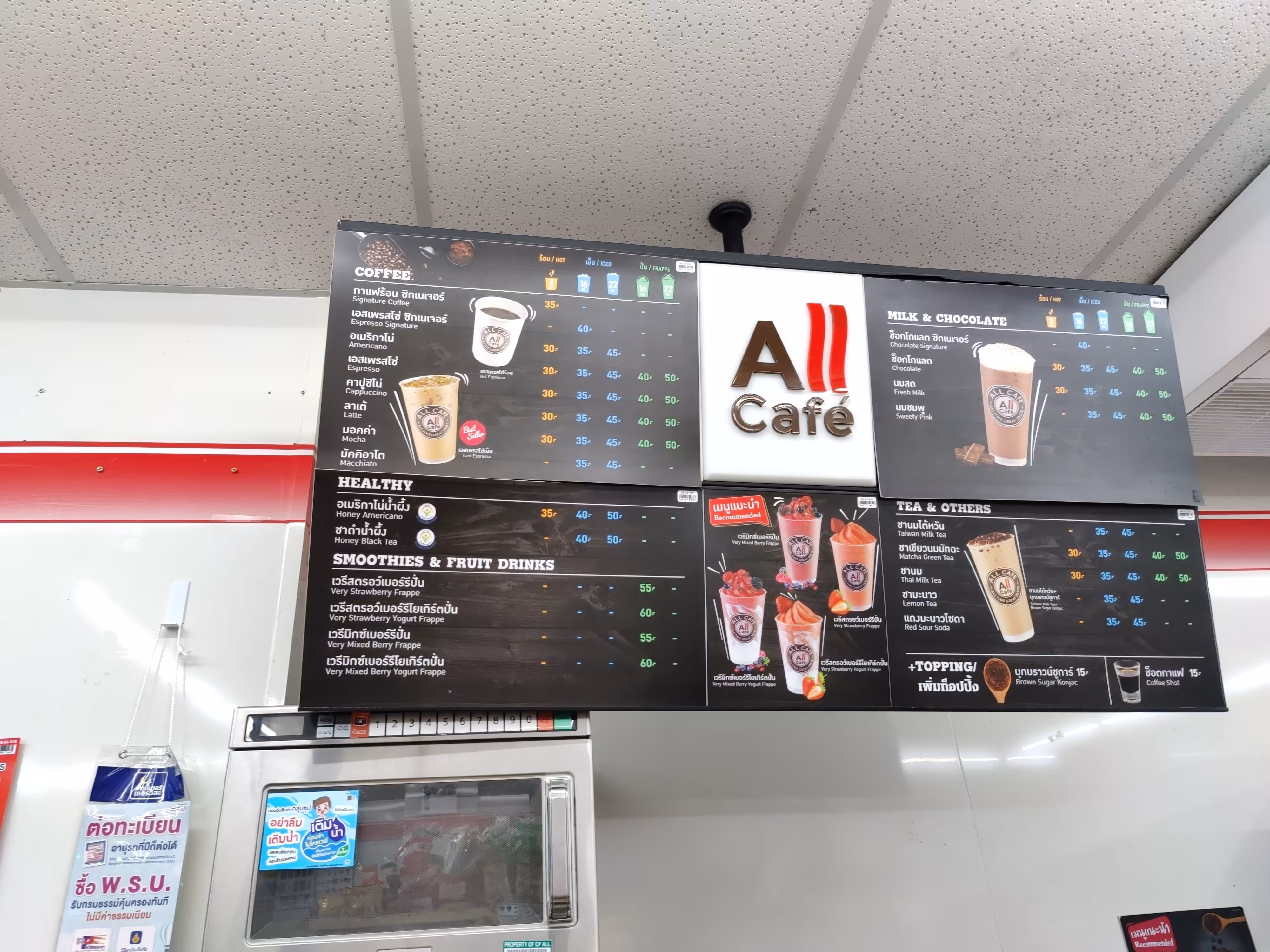 A board showing coffee menu at a 7-Eleven store along with rates in Pattaya.